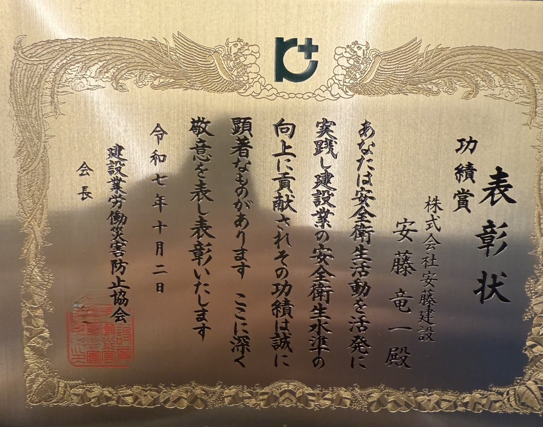 第62回全国建設業労働災害防止大会で功績賞の表彰を受けました。