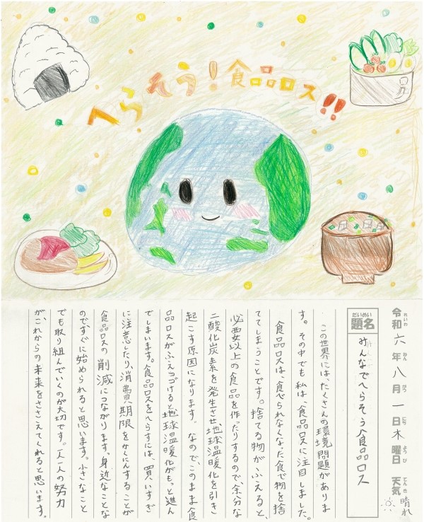 2024.11.24 環境絵日記2024 環境絵日記2024で企業賞として株式会社安藤建設賞を授与しました。 食品ロスに関する問題提起は非常に重要です。 食品ロスが地球温暖化に与える影響を考えると、私たち一人一人ができることから始めることが大切です。 買い過ぎを避け、消費期限を確認することで、無駄を減らすことができます。 小さな努力が積み重なれば、大きな変化を生むことができるでしょう。 未来のために、今から行動を起こしましょう。 PREV NEXT BACK